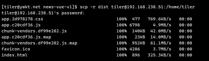 通过npm编译打包vue框架前端应用程序,并将生成的静态内容上传至Nginx前端服务器。